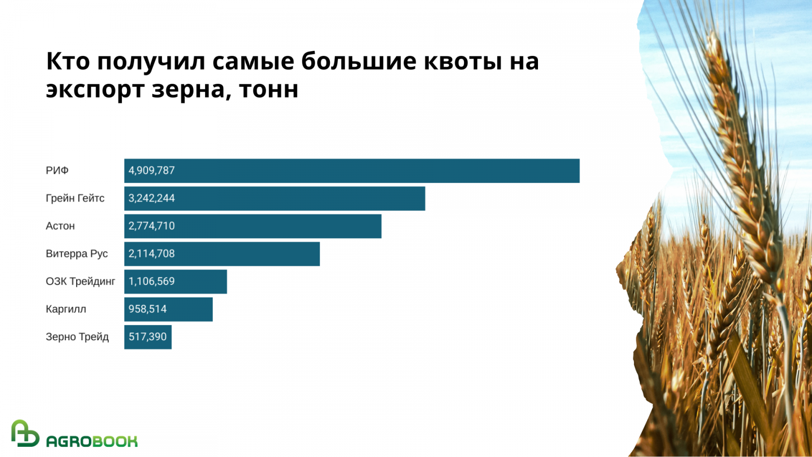 В списке, опубликованном Минсельхозом, оказалось 203 компании, Объёмы им предоставлены разные. Например, ООО «Трапеза» получила квоту всего в 19,5 тонн зерна, а «Рифу» позволили вывезти  4 миллиона 909 тысяч тонн.