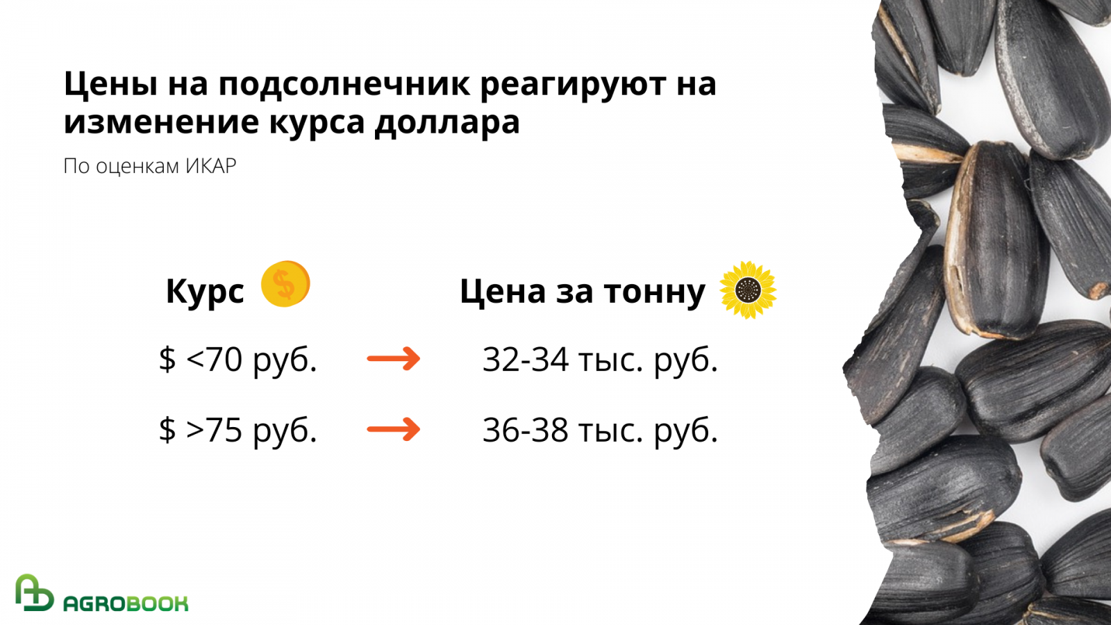 Впрочем, в отличие от пшеницы, цены на подсолнечник всё-таки реагируют на изменение курса доллара. Чем слабее рубль – тем выше могут подняться цены. По оценкам ИКАР, в ЦФО на базисе СРТ тонна подсолнечника сегодня стоит 34,5 тысячи рублей с НДС. Если доллар будет дешевле 70 рублей, то цена окажется в коридоре 32-34 тысячи рублей. При подорожании доллара свыше 75 рублей, цена поднимется до 36-38 тысяч рублей за тонну. То же самое и с ценой на сою: при крепком рубле может быть падение до 37-39 тысяч рублей, при крепком долларе – повышение до 44-45 тысяч рублей.