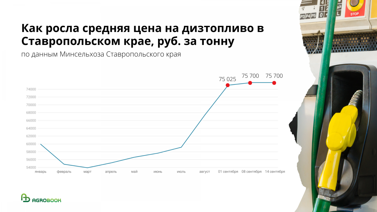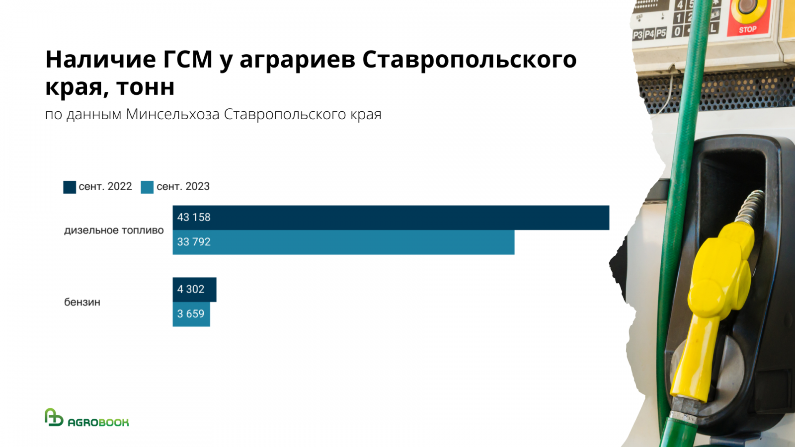 Минсельхоз Ставропольского края сообщает, что аграрии обеспечены дизтопливом на 126%, правда, речь идёт только о потребности на сентябрь. Естественно, в этом году запасы ГСМ у сельхозпроизводителей ниже, чем в середине сентября прошлого года.
