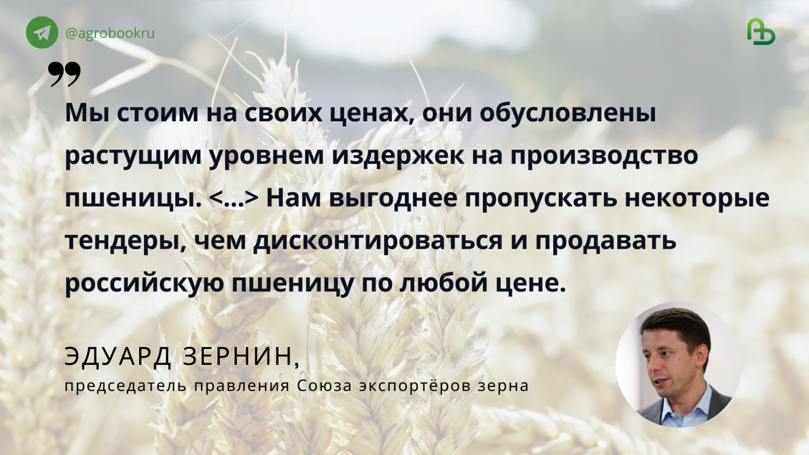 Союз экспортёров зерна высказывает солидарность с позицией Минсельхоза. Эдуард Зернин дал понять, что трейдеры готовы проигрывать в некоторых тендерах, но стоять на своих ценах, поскольку они обусловлены ростом себестоимости зерна.