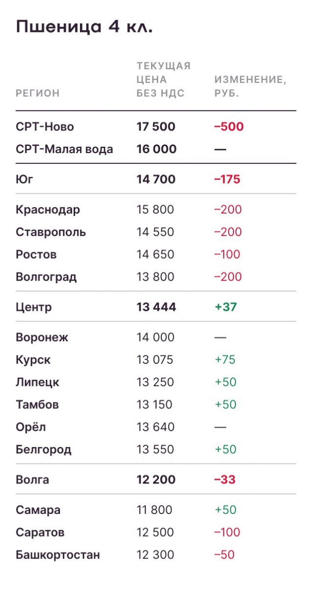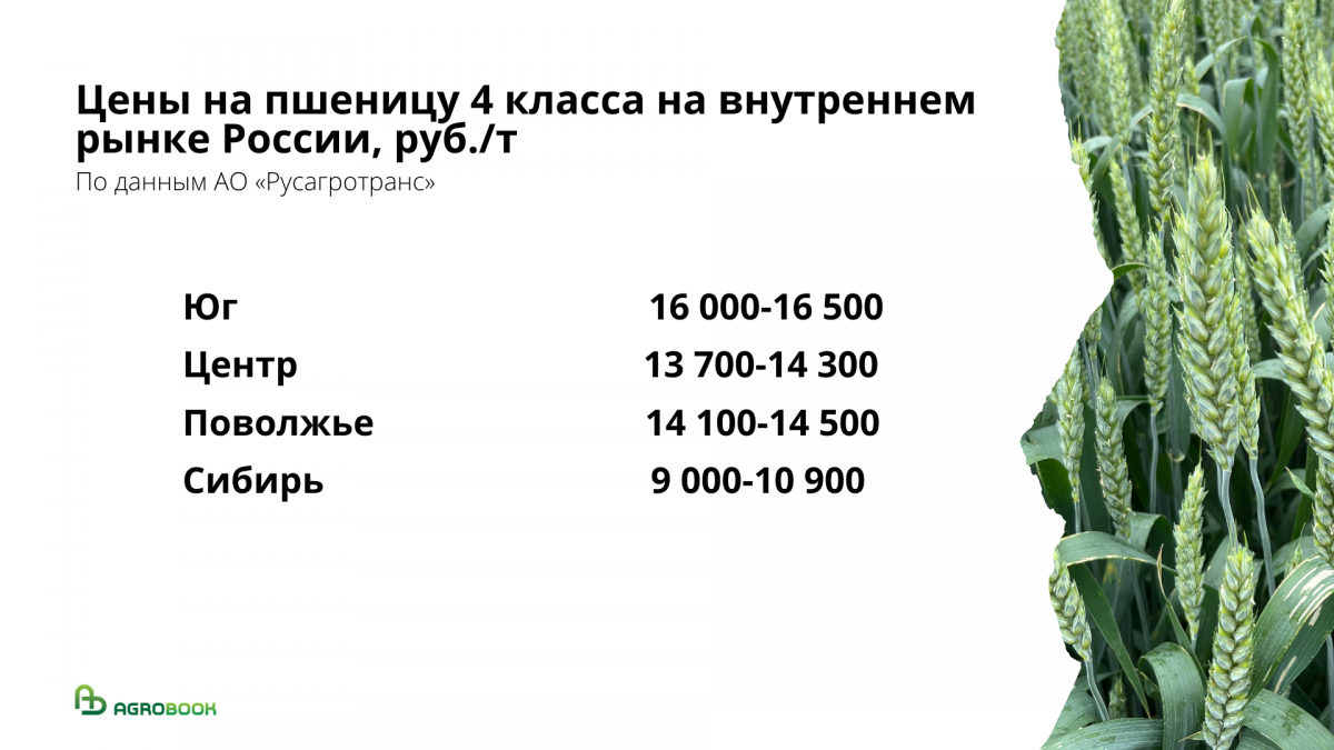 В регионах России, на базисе франко-элеватор, пшеница четвёртого класса стоит, конечно, значительно дешевле. «Русагротранс» приводит такие данные: