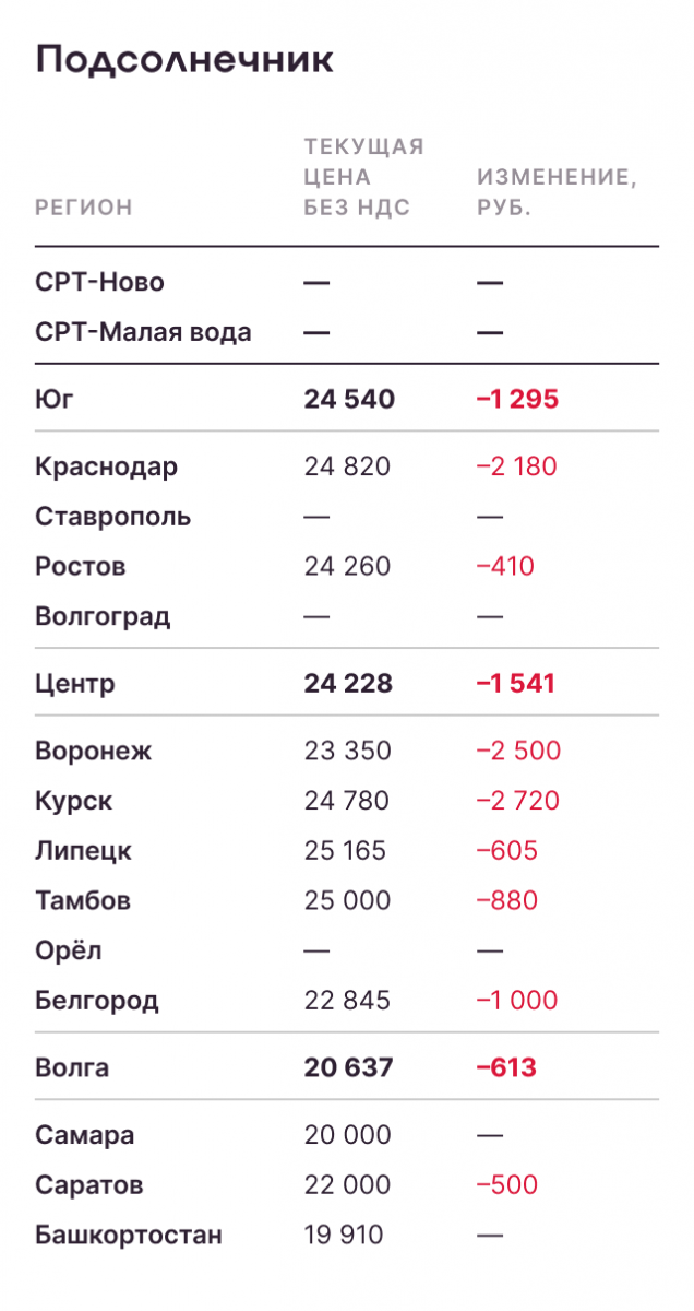 На юге России полным ходом идёт уборка подсолнечника, и этот факт ожидаемо обвалил цены на семечку. Глава компании «ПроЗерно» Владимир Петриченко сообщает, что в европейской части России подсолнечник стоит около 27 тыс. рублей за тонну с НДС, но далее возможен рост до 30-33 тысяч рублей.