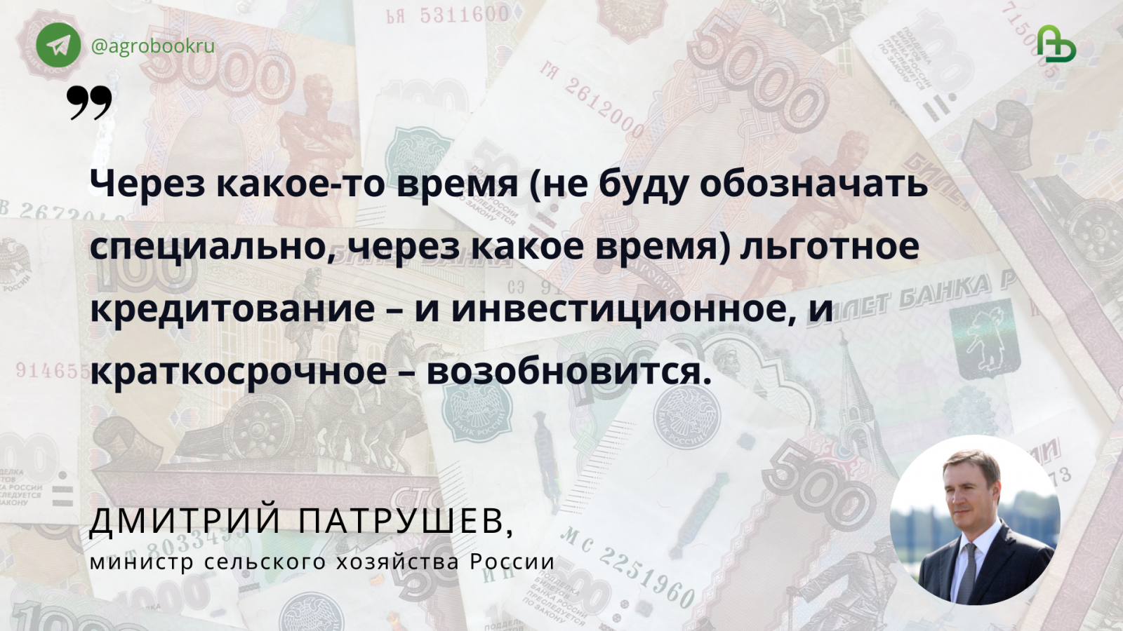 На совещании в Госдуме, о котором мы говорили в начале выпуска, министру Дмитрию Патрушеву задали вопрос – когда возобновится льготное кредитование аграриев. Глава Минсельхоза ответил, что сейчас ведомство обсуждает с правительством, где взять на это деньги. И пообещал, что к концу года финансирование точно возобновится. Правда, определённый срок Патрушев обозначать не стал.