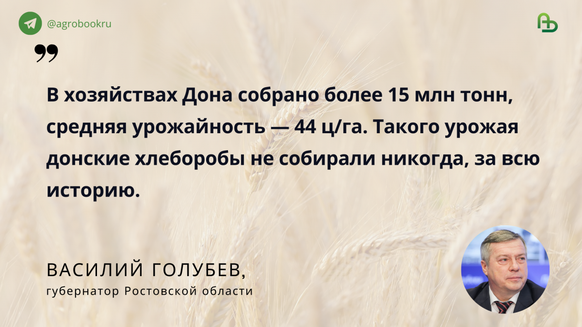 Губернатор Ростовской области Василий Голубев подтвердил, что год был рекордным по сбору зерна: в хозяйствах Дона собрано более 15 млн тонн, средняя урожайность — 44 ц/га. Такого урожая донские хлеборобы не собирали никогда, за всю историю. Глава региона заметил, что цифра ещё может уточняться, но теперь только в большую сторону. В прошлом году валовой сбор был на полмиллиона ниже, а средняя урожайность составляла всего 42,2 ц/га.