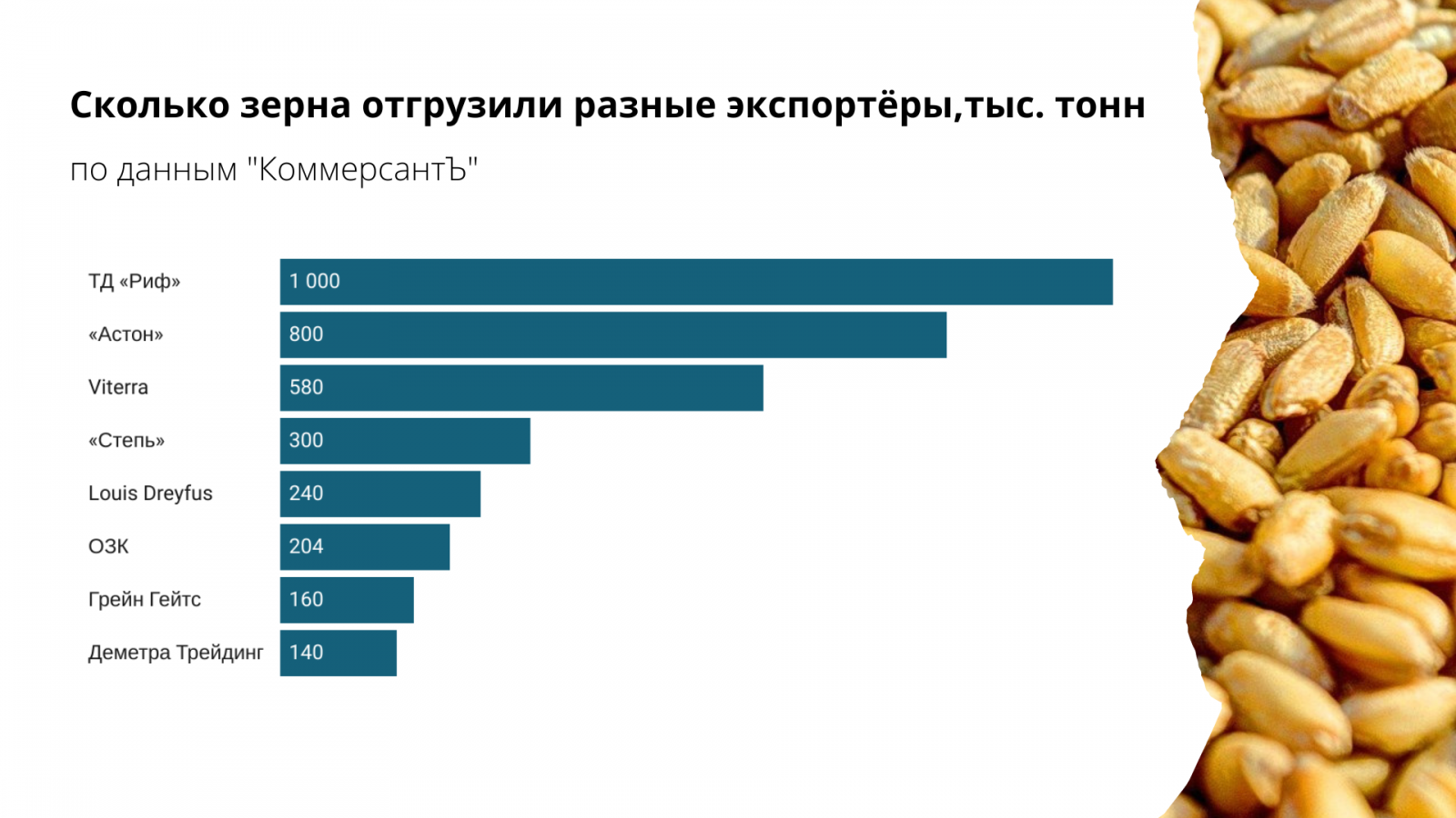Издание «Коммерсант» выяснило, что в результате всех геополитических сложностей изменилась структура главных экспортёров. На вершине по-прежнему остаются «Риф» и «Астон», а вот Объединённая зерновая компания вдвое сократила отгрузки по сравнению с началом сезона в 2021 году. В компании это объяснили последствиями антироссийских санкций. Неожиданно на десятом месте оказалась и «Деметра» – видимо, по той же причине.