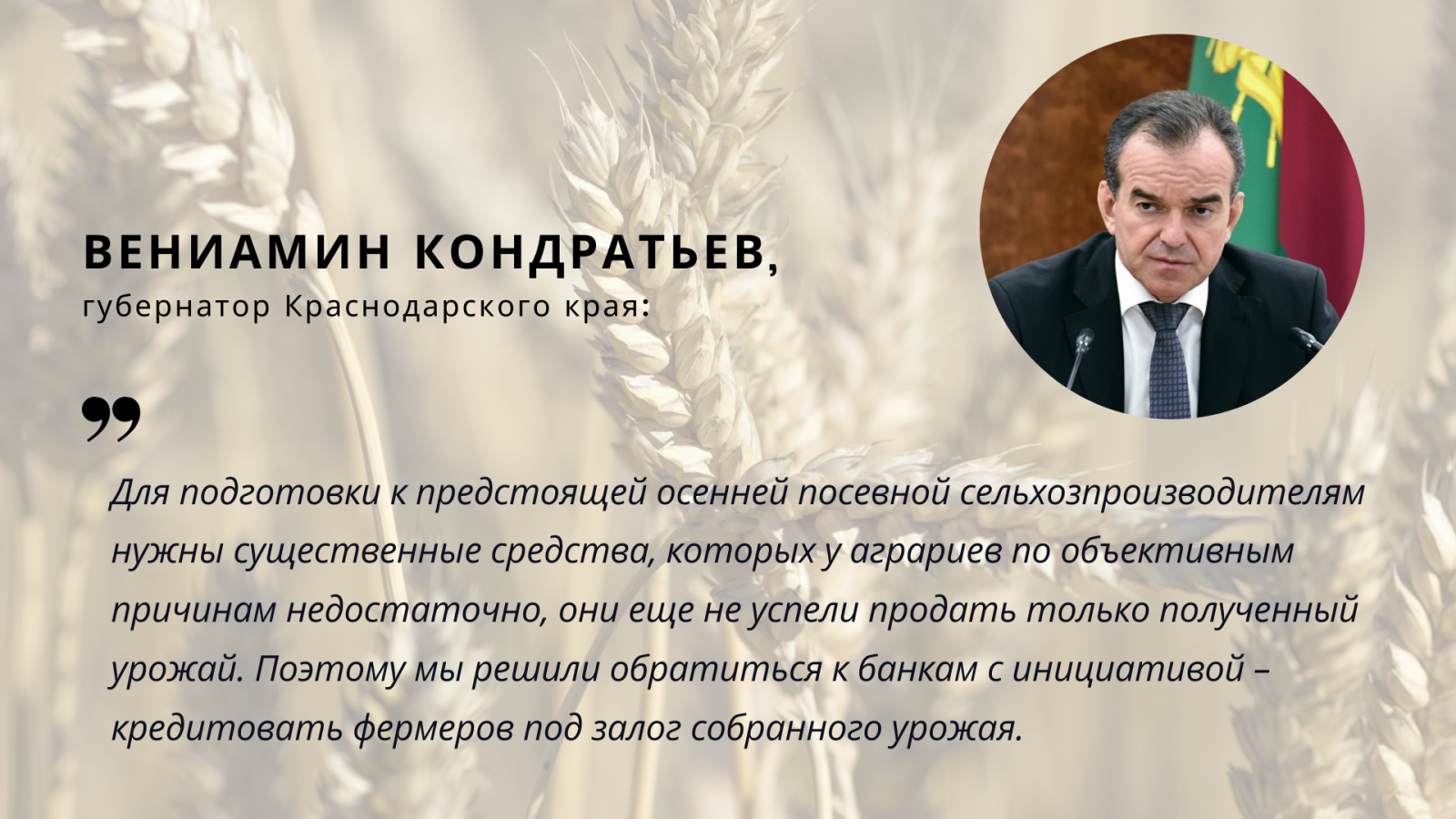 «Для подготовки к предстоящей осенней посевной сельхозпроизводителям нужны существенные средства, которых у аграриев по объективным причинам недостаточно, они еще не успели продать только полученный урожай, – заметил Вениамин Кондратьев. –  Поэтому мы решили обратиться к банкам с инициативой – кредитовать фермеров под залог собранного урожая. Погасить заем они смогли бы сразу после реализации продукции».