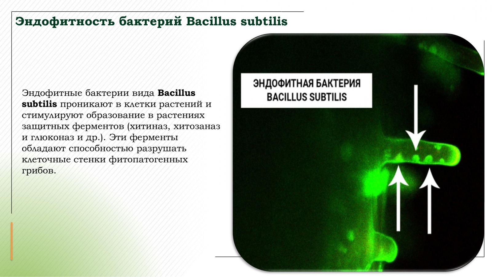 Bacillus subtilis – эндофитная бактерия, у неё есть уникальное свойство проникать в корневые волоски, в сам корень. Колонии Bacillus subtilis служат преградой для проникновения фитопатогенов, а также вырабатывают вещества (аминоклислоты, фитогормоны, полисахариды и др.), которые стимулируют ростовые процессы.