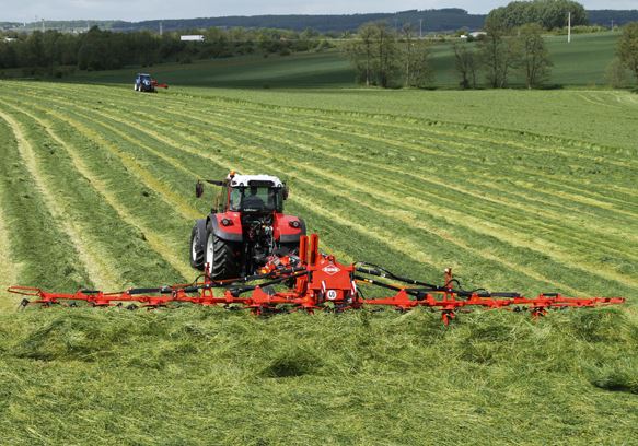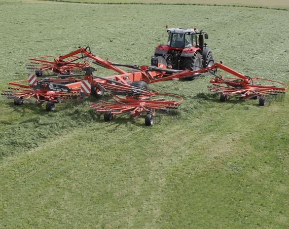 Ширина валка на них, в соответствии с полевыми потребностями, регулируется прямо из кабины трактора. И, кроме того, при работе с таким типом граблей культура минимально травмируется. У компании КУН (KUHN) такие валкообразователи представлены серией MERGE MAXX.