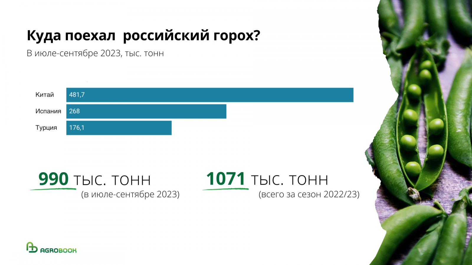 В завершение блока хотелось бы поделиться ещё одной любопытной новостью. На рекордные показатели идёт экспорт гороха. Как сообщает аналитическая компания «ПроЗерно», с июня по сентябрь текущего года Россия отгрузила за рубеж 990 тысяч тонн гороха, что сопоставимо с объёмами всего прошлого сезона. Тогда за границу было отправлено 1 071,7 тыс. тонн гороха.