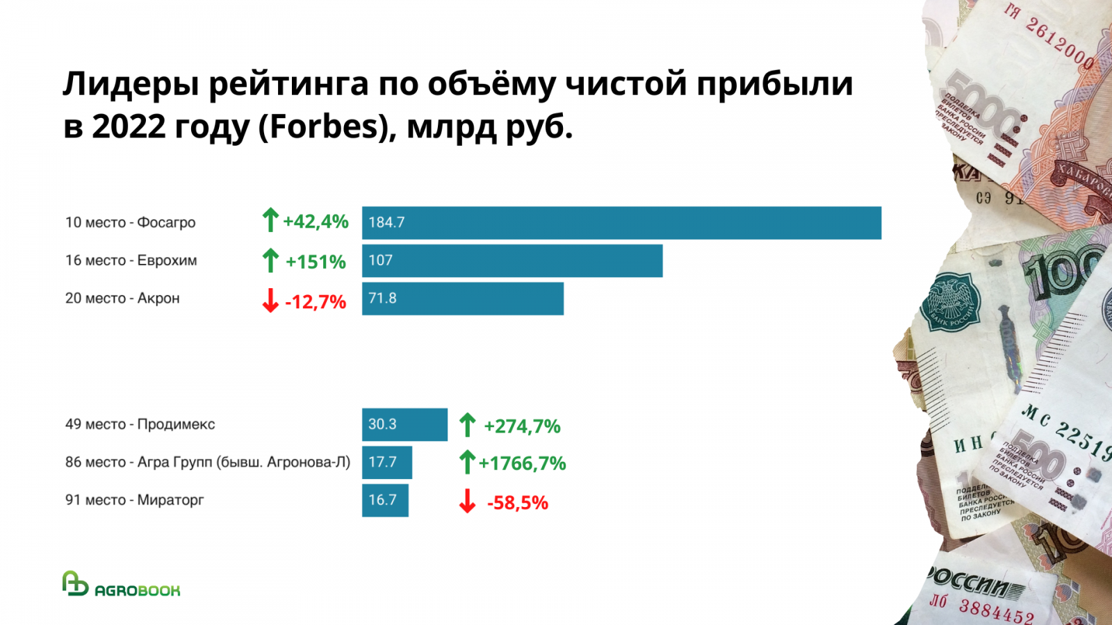 Переходим к любимому занятию: подсчёту денег в чужом кармане. На днях журнал Forbes опубликовал рейтинг российских компаний-лидеров по чистой выручке, которую они получили в 2022 году. В первую десятку попали компаний нефтегазового сектора, Сбербанк, Норильский Никель и Фосагро, которая увеличила свою чистую прибыль на 42,4%. Чистая прибыль компании в 2022 году составила 184,7 млрд рублей.