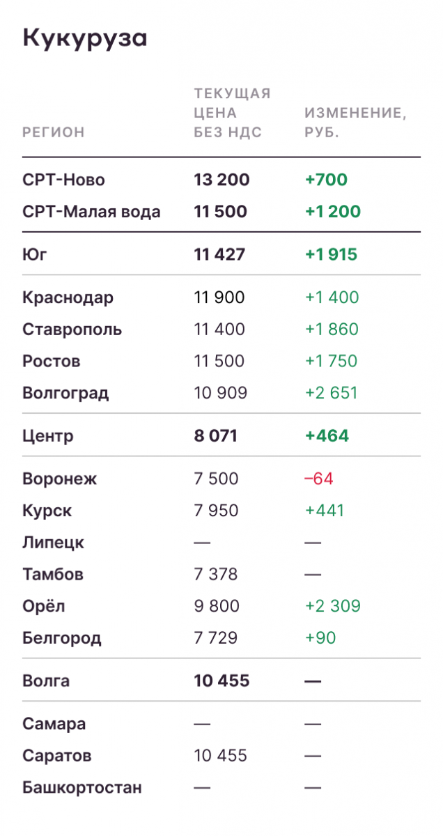 Немного оживился рынок кукурузы. Повышение здесь довольно заметное, и аналитики «Русагротранса» связывают это с несколькими факторами: рост спроса со стороны Турции и Ирана, высокий спрос на кукурузу в Центральной России, усиление отгрузок кукурузы в направлении Турции, которое увеличило цены в портах на 500-700 рублей за тонну. Эти предпосылки позволяют рассчитывать, что в ближайшие две-три недели цены могут ещё укрепиться. Индекс кукурузы в глубоководных портах Чёрного моря и Каспия при этом, по данным Национальной товарной биржи, 16 октября упал до 195 долларов за тонну. В конце сентября индекс колебался в районе 208-214 долларов.