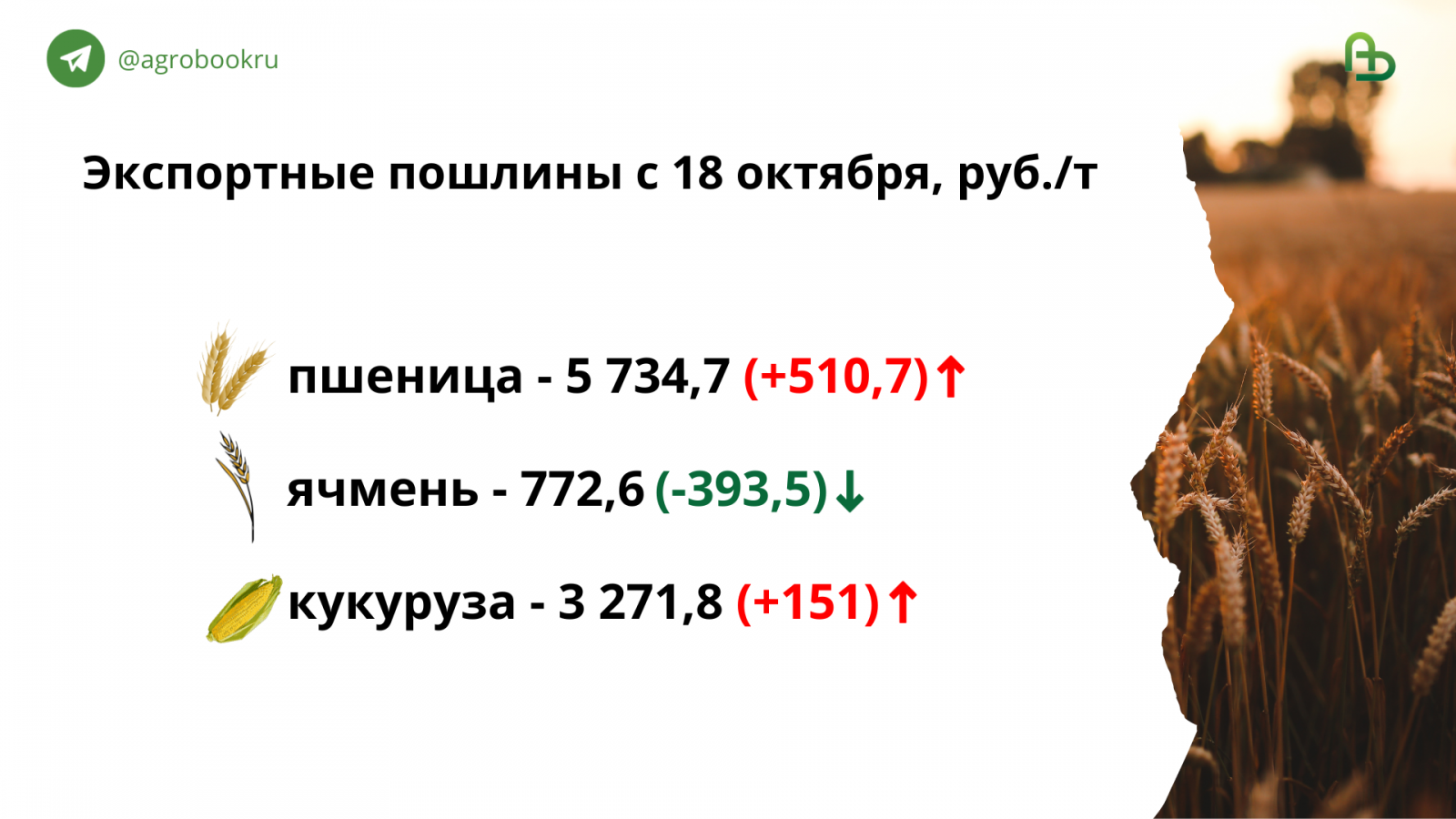Плавающая пошлина на пшеницу продолжает расти. С 18 октября сбор по пшенице вырастет почти на 10% и составит 5 734,7 рубля. Зато неплохо падает пошлина на ячмень – ставка опускается почти на 400 рублей. Пошлина на кукурузу демонстрирует небольшой рост.