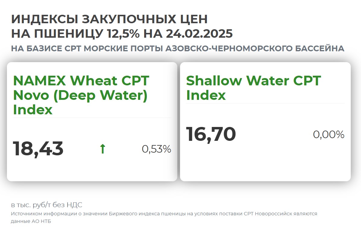 Непредсказуемость погоды в России и долгий недобор осадков, как полагают эксперты, сыграли роль «бычьего фактора» на мировом рынке пшеницы. По данным АЦ «Русагротранса», экспортные цены на российскую пшеницу с протеином 12,5% с поставкой в феврале-марте увеличились до $252/т FOB (+$7/т за неделю и +$16/т за месяц). Цены практически достигли уровня конца мая 2024 года, когда мировой рынок отреагировал на потенциальные потери урожая из-за возвратных заморозков в России. Цена на румынскую пшеницу выросла до $250/т (+$2/т), французская пшеница подешевела до $244/т (-$2/т).