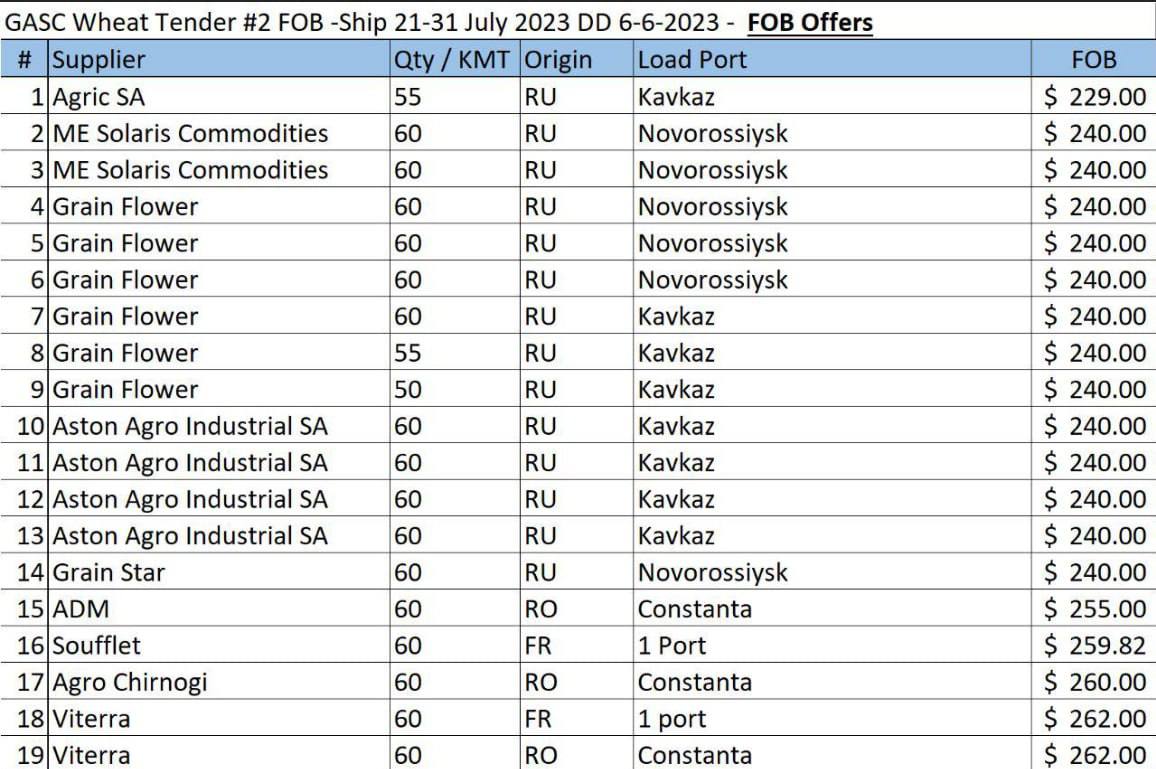 Экспортёры, судя по всему, с инициативой Минсельхоза согласились. 7 июня египетская GASC объявила тендер на покупку пшеницы, и все российские зерно рейдеры - кроме одной компании - назвали цену FOB ровно 240 долларов за тонну.