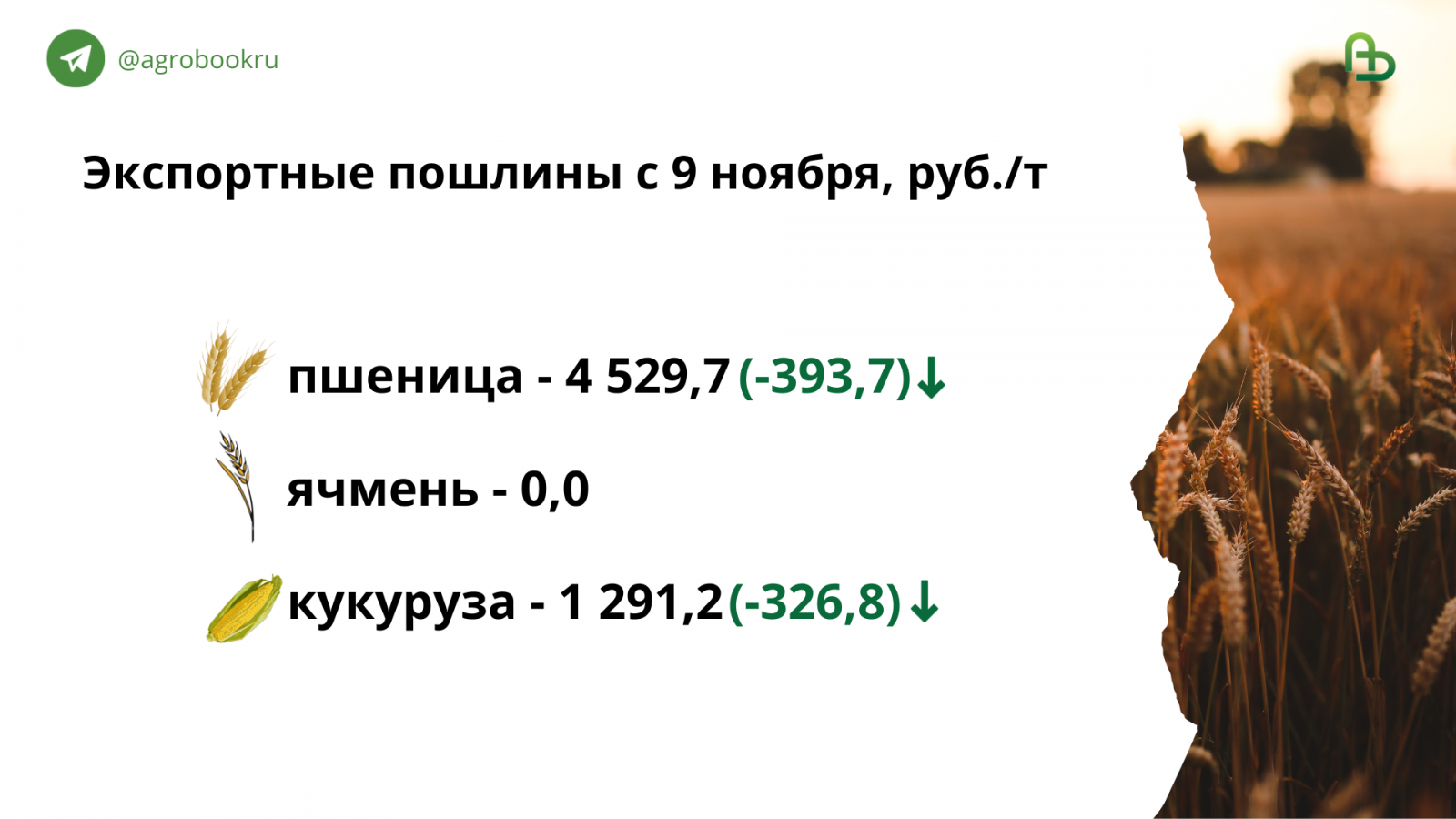 Ставки экспортных пошлин на зерновые культуры в ближайшую неделю снизятся, но это ничего не меняет. СРТ-индекс на пшеницу с протеином 12,5, по данным Союза экспортёров зерна, остаётся на уровне 14,5 тысяч рублей в глубоководных портах и 12 тысяч рублей на малой воде.
