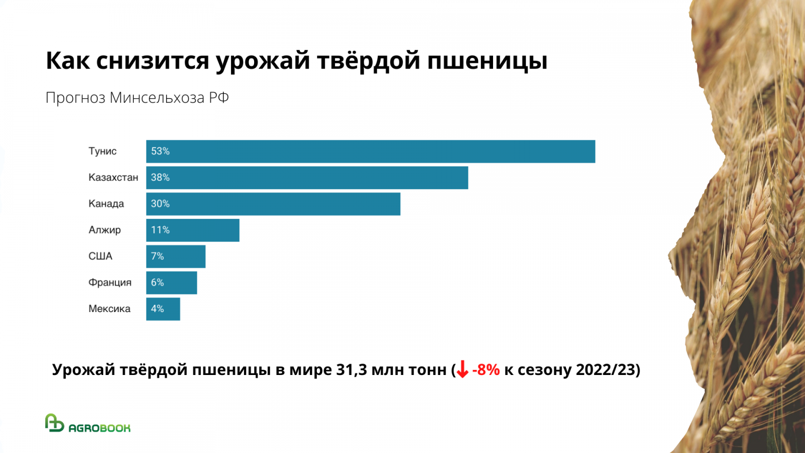 Эмбарго на вывоз дурума предполагают ввести с 1 декабря 2023 года до 31 мая 2024 года. На последний месяц сельскохозяйственного года запрет распространяться не будет – видимо, для того, чтобы можно было экспортировать излишки, если они образуются.