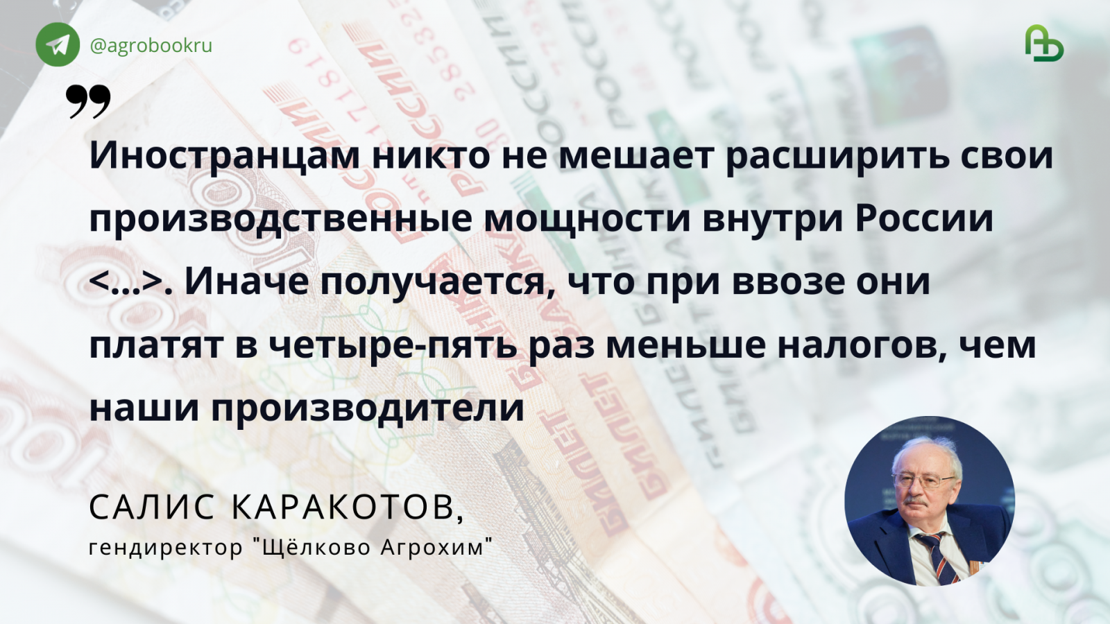 Гендиректор «Щелково Агрохим» Салис Каракотов ещё в сентябре говорил, что введение квот положительно повлияет на рынок. В интервью «Агроинвестору» он отмечал, что среди российских товаров можно найти почти любой препарат, в котором нуждаются сельхозпроизводители. Каракотов также заметил, что иностранцам никто не мешает расширить производство внутри России – иначе получается, что при ввозе они платят в четыре-пять раз меньше налогов, чем отечественные производители.