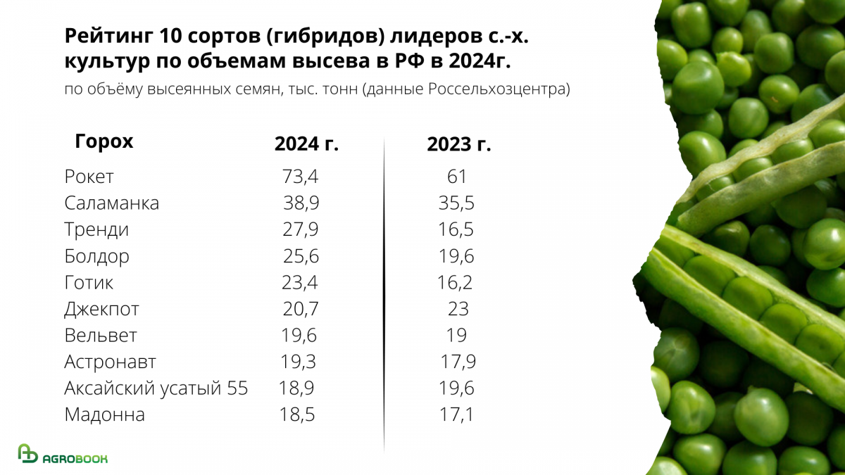Самыми востребованными сортами гороха оказались зарубежные: Рокет, Саламанка, Тренди, Болдор, Готик, Джекпот, Вельвет, Астронавт, Мадонна – всё это достижения европейских селекционеров. Впрочем, на девятом месте остался единственный отечественный сорт Аксайский Усатый 55, зарегистрированный ещё в 2003 году.