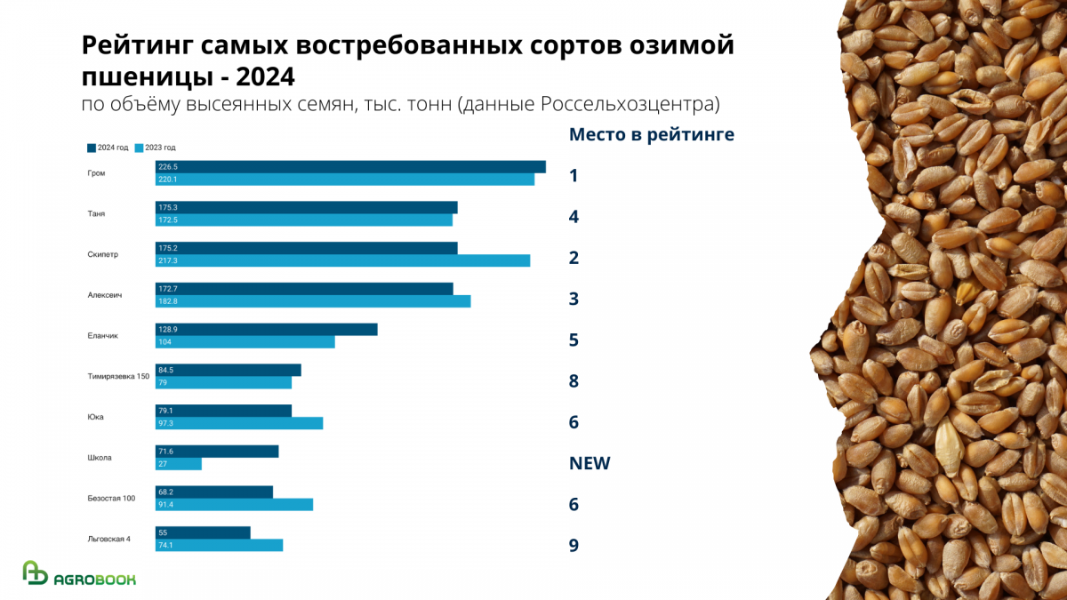 Список самых популярных сортов озимой пшеницы возглавил лидер прошлого года – сорт Гром, за ним последовали Таня, Скипетр, Алексеич, Еланчик, Тимирязевка 150, Юка, Школа, Безостая 100 и Льговская 4. Восемь из десяти позиций заняла селекция Национального центра зерна им. П.П.Лукьяненко.