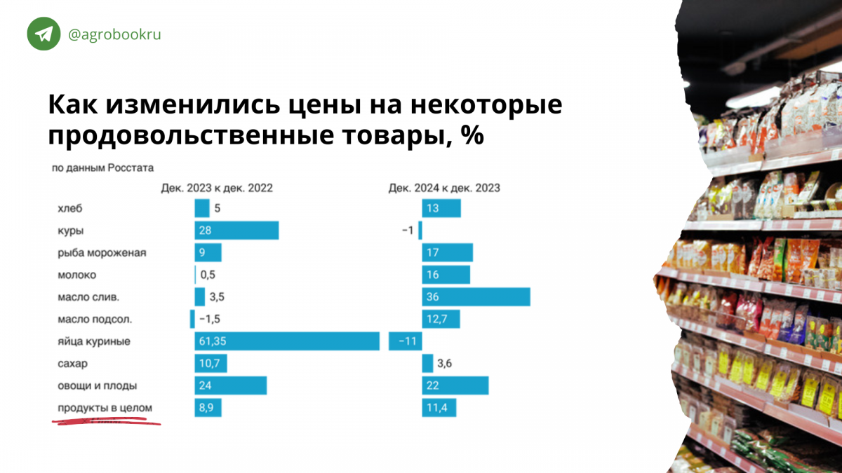 Как следует из данных Росстата, опубликованных на прошлой неделе, потребительские цены на продукты выросли на 11% в декабре 2024 года по сравнению с декабрём 2023 года. Рост цен на продукты опережал годовую инфляцию, которая составила 9,5%. Банк России прогнозировал, что по итогам 2024 года инфляция будет в диапазоне от 8 до 8,5%.