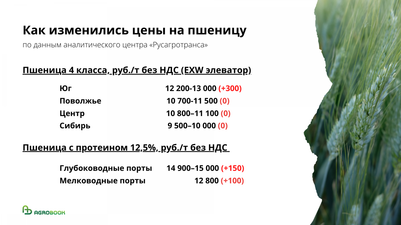 Небольшой подъём цены произошёл в портах: по данным аналитического центра «Русагротранса», в глубоководных портах пшеница с протеином 12,5% стоит около 15 тысяч рублей без НДС, на малой воде – 12 800-13 тысяч рублей. Экспортная цена на российскую пшеницу остаётся на уровне 317 долларов за тонну.