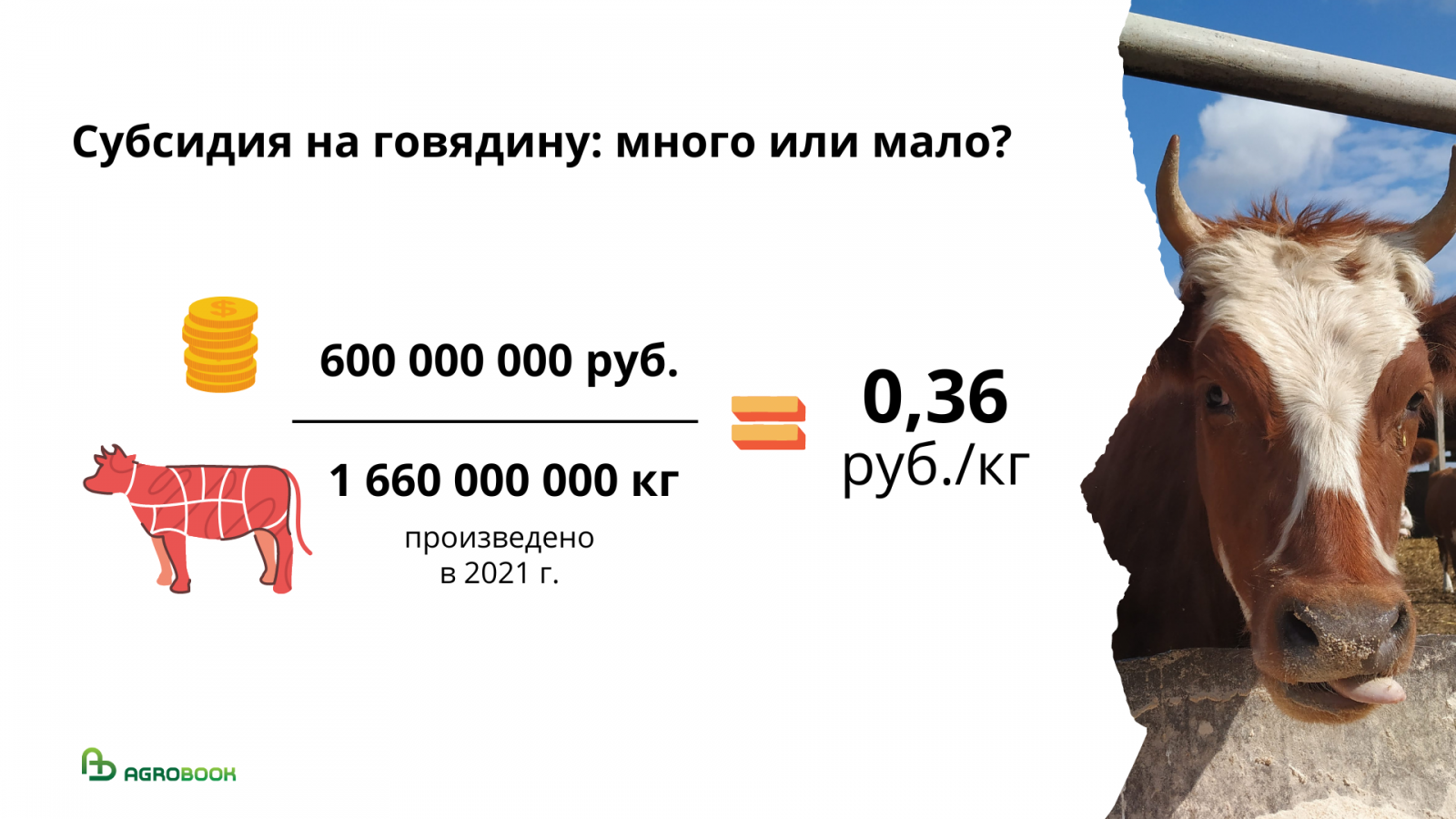 Много это или мало? По данным Национального союза производителей говядины, в прошлом году производство этого вида мяса в России составило 1 миллион 660 тысяч тонн. Если бы на субсидирование этого объёма мяса в 2021 году было выделено 600 миллионов, то за каждый килограмм мяса фермер мог был получить компенсацию в размере 36 копеек. Но это, конечно, мы считали производство говядины в целом, то есть с учётом выбракованных молочных коров. Если же взять только бычков, субсидия, конечно, окажется выше – может быть, даже достигнет беспрецедентных трёх рублей за килограмм.