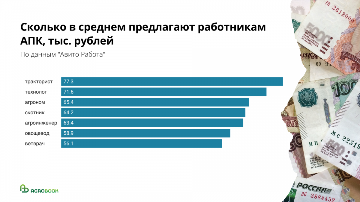 Сервис «Авито Работа» выяснил, что в сентябре средняя предлагаемая зарплата в аграрном секторе выросла на 27% и составила 64 435 рублей. Самой востребованной на рынке оказалась вакансия тракториста: количество вакансий выросло более чем в три раза, а средняя предлагаемая зарплата – до 77,3 тыс. рублей. Активно ищут хозяйства овощеводов, агроинженеров и ветврачей. Этим специалистам предлагают зарплаты около 60 тыс. рублей в месяц. А ещё за год резко выросли предлагаемые зарплаты у скотников: сразу на 58%, до 64,2 тыс. рублей.