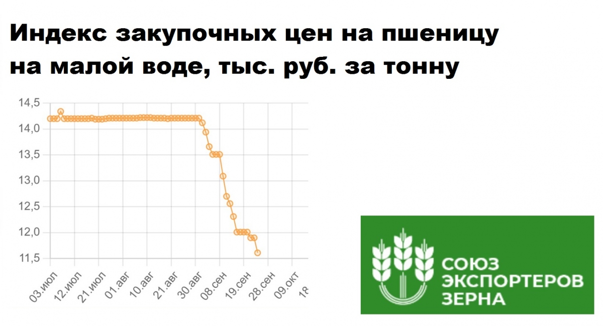 Закупочные цены на пшеницу в портах по-прежнему низкие и никак не подберутся к 15 рублям. На малой воде цена рухнула практически до 11,5 рублей за килограмм.