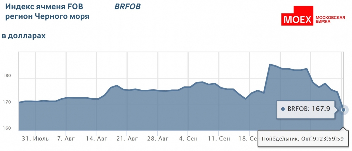 Индекс ячменя, напротив, пошёл на спад. Если в конце сентября цена превышала 180 долларов за тонну, то в понедельник она опустилась ниже 170.