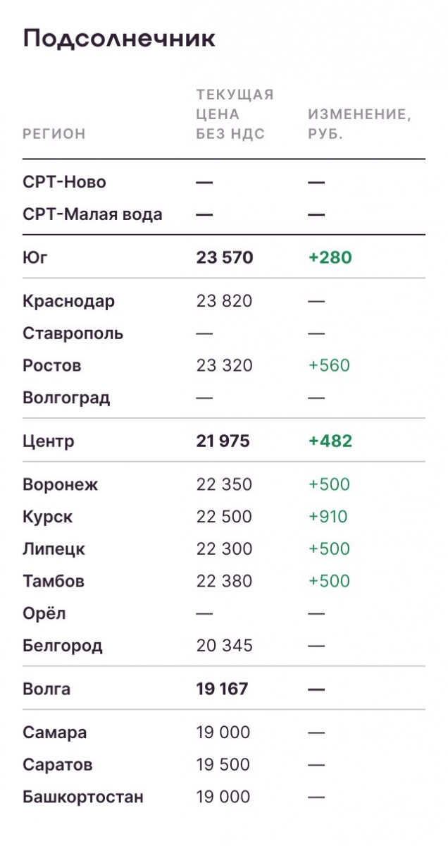 По данным Минсельхоза, валовой сбор основных масличных культур достиг 24 млн тонн, что в полтора раза выше показателя за аналогичный период 2022 года. В том числе урожай подсолнечника превысил 14,1 млн тонн, что в 1,8 раза выше прошлогоднего показателя.Закупочные цены на подсолнечник немного подёргиваются вверх, агентство OleoScope объясняет это благоприятной мировой конъюнктурой и конкуренцией маслозаводов за сырьё. МЭЗы ожидают, что мировая стоимость подсолнечного масла будет и дальше расти. По оценкам OleoScope, стоимость тонны подсолнечника (с НДС) в ЦФО составляет 24,8 тыс. руб., в ПФО — 22,2 тыс. руб., в ЮФО — 25,7 тыс. руб. Портал Поле.рф отмечает рост по всем базисам поставки.
