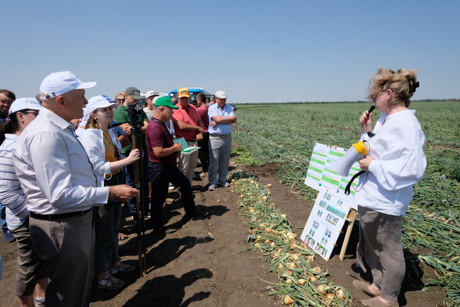 После осмотра техники гости Дня поля отправились на посевы озимого лука сорта Трой. Главный агроном хозяйства Сергей Воронов кратко рассказал о технологии выращивания лука.
