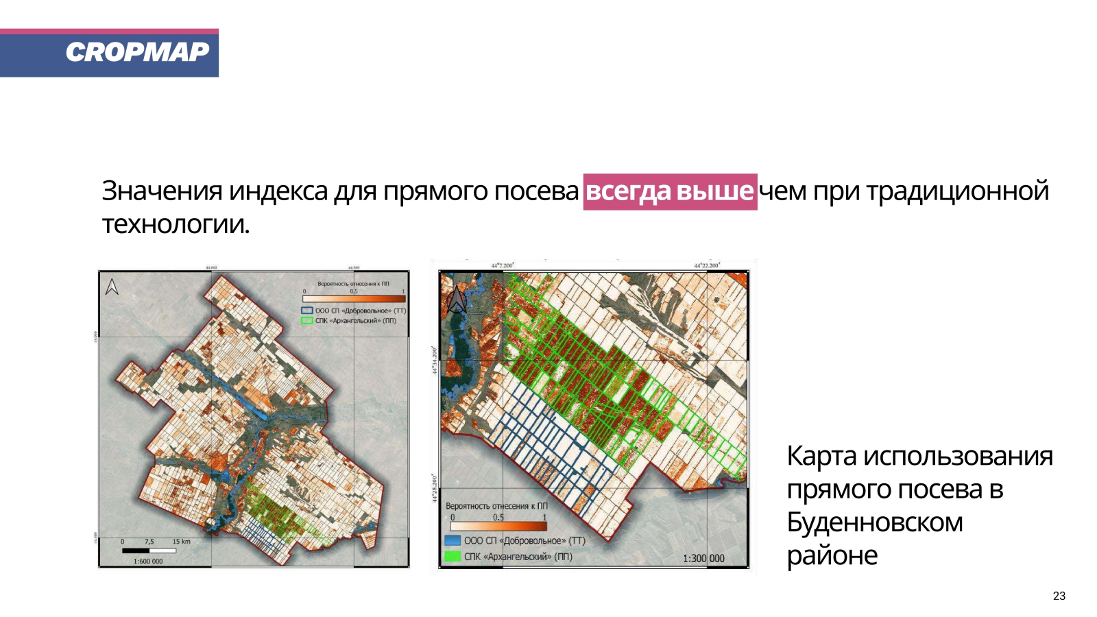 В Будённовском районе Ставропольского края на полях хозяйства, которое практикует ноутил, система Cropmap использовалась для того, чтобы оценить равномерность распределения растительных остатков на поле. С такой задачей не каждое ПО может справиться: ведь снимки из космоса важно не просто «увидеть», а дешифровать в различных цветовых спектрах. Как пояснил эксперт Cropmap Никита Ермолаев, исследование полей при помощи «Карты урожая» позволило не только оценить проективное покрытие почвы растительными остатками на поле ноутил (оно, кстати, оказалось неоднородным), но даже определить качество обработки на соседнем поле, где работали по классической технологии – так чётко система Cropmap смогла «увидеть» сельскохозяйственные угодья!