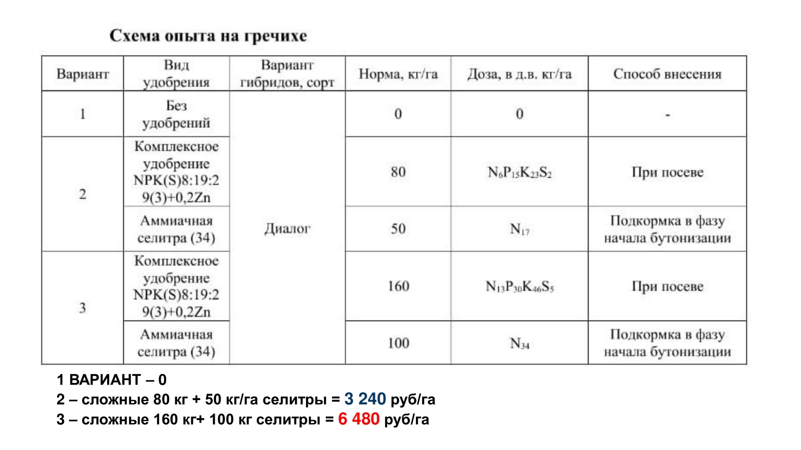 Далее на этом поле был проведён сев гречихи, и «поперёк» опыта с покровными культурами заложили ещё один – с двумя вариантами схем минерального питания гречихи и контролем (без питания).