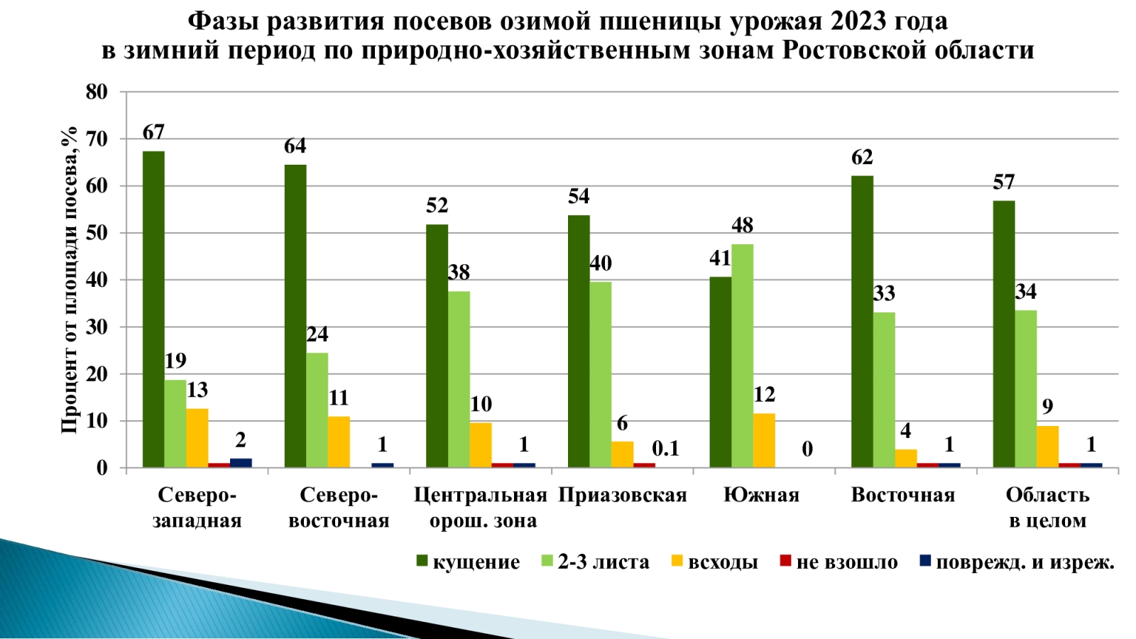 Эксперт отметила, что по природно-хозяйственным зонам Ростовской области «картинка тоже радует»: больше половины посевов уже в фазе кущения, в стадии шильца растений мало.