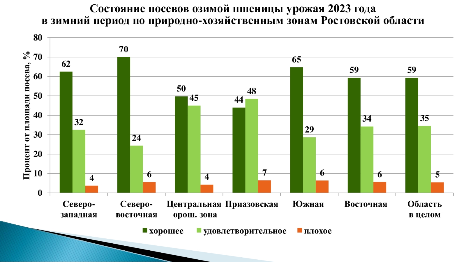 Доля посевов озимой пшеницы в плохом состоянии не превышает 5%, однако наблюдаются низкие запасы влаги и признаки дефицита азота. Об этом сообщила директор ФГБУ ГЦАС «Ростовский» Ольга Назаренко на «Зимней зерновой конференции 2023. Интенсив для агрономов», которую провёл портал Agrobook.ru.