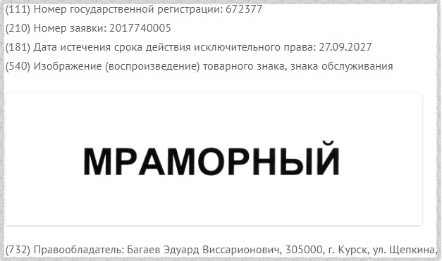 Согласно решению Роспатента, исключительное право на торговый знак «Мраморный» с 24 сентября 2018 года по 27 сентября 2027 года принадлежит индивидуальному предпринимателю Эдуарду Виссарионовичу Багаеву.