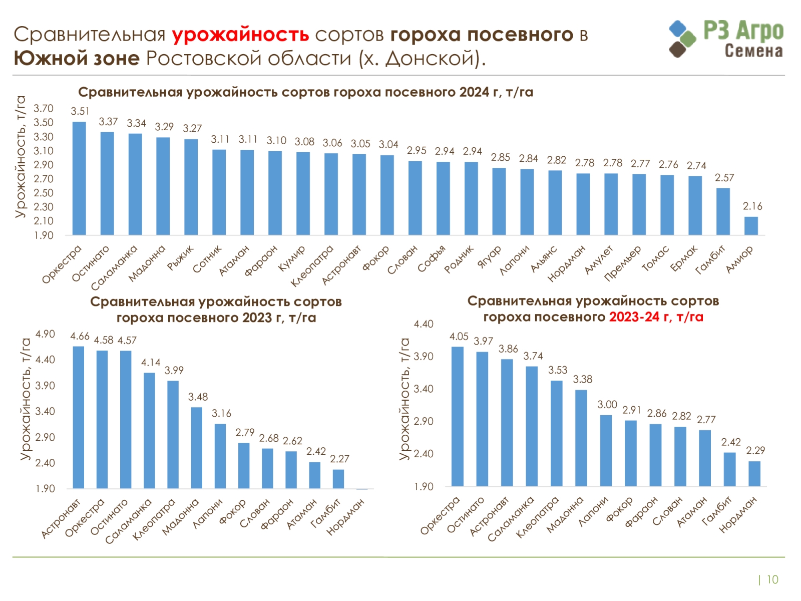 – Данный слайд демонстрирует урожайность различных сортов гороха, которые мы исследовали у себя в производстве. Российская селекция в условиях 2024 года по урожайности приблизилась к иностранной селекции, – отметил Торос Корманукян.