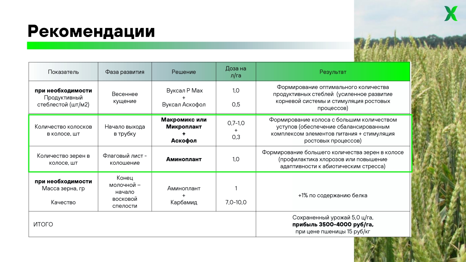 Эксперт напомнила, что оптимальное питание в фазе Z 29-31 влияет на закладку величины колоса и его выполненность. Улучшая обеспеченность питанием в этот период, можно получить колос со средним числом колосков 22 и выше: при благоприятных условиях заполняется верхушка колоса и его основание, которые обычно остаются пустыми.