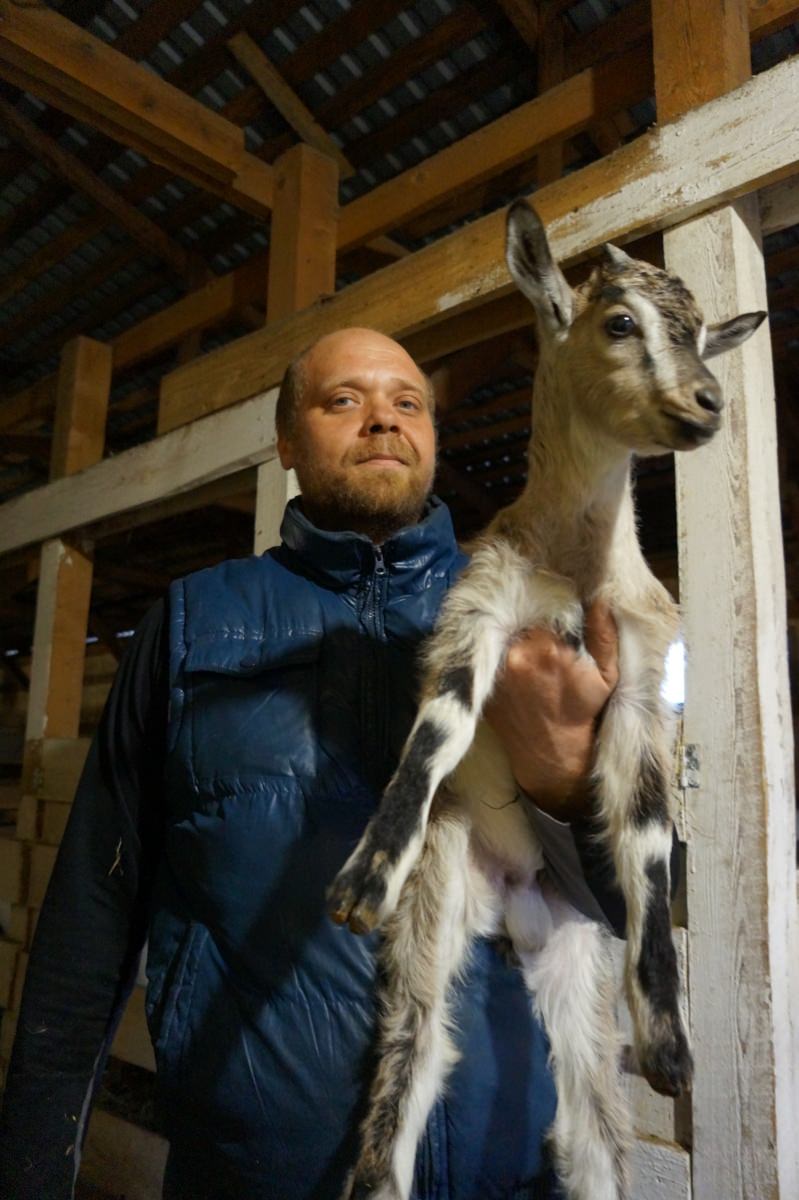 Небольшая комнатушка в ангаре с козами оборудована всем необходимым для жизни. Есть дровяная печь, ноутбук. На полке среди строительных инструментов – неизрасходованный флакон духов. Супруги живут на ферме постоянно, в квартиру ездят только купаться. Поесть и поспать можно и здесь. Правда, они не успевают это делать вволю. Особенно трудно зимой, когда рождаются козлята. Ветеринарного образования у Нади нет, но практика уже богатая.