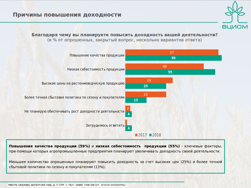 Доступных инструментов повышения доходности в представлении аграриев не так много. В текущем сезоне выросло количество тех, кто рассчитывает сделать это за счет повышения качества продукции и снижения себестоимости. И снизилось количество тех, кто надеется на высокие закупочные цены.