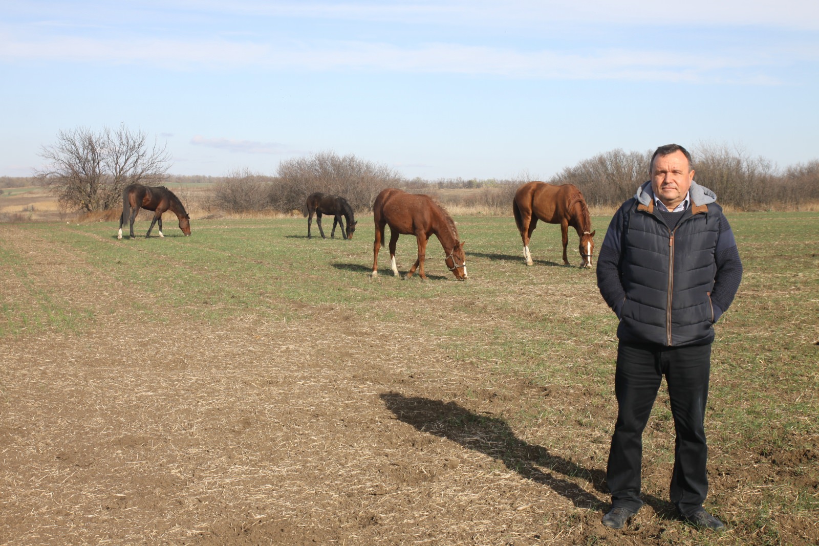 Председатель СПК колхоза «Маяк» Сергей Кулиш показывает поле с озимой пшеницей. На свежих всходах пасутся лошади.