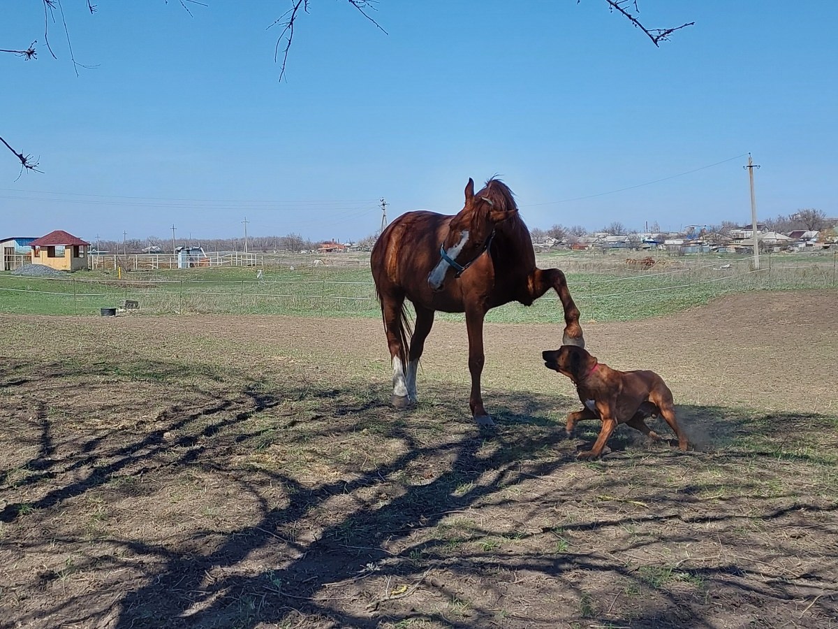 Порода риджбек выводилась для охоты на львов. Этому кобелю приходится играть с лошадьми. Импортозамещение в действии (фото В. Никитченко)