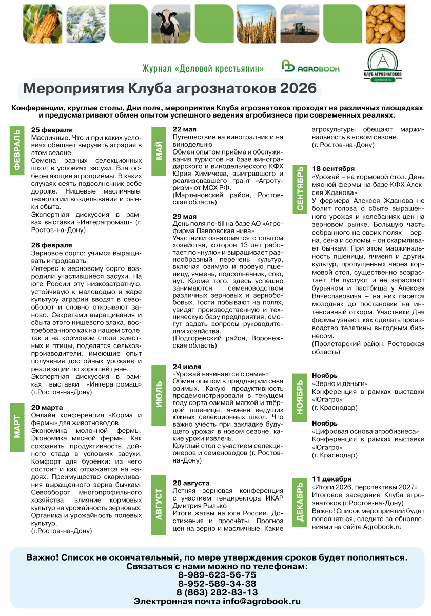 Перед вами – список мероприятий Клуба агрознатоков на 2026 год. Это будут дни поля, дни фермы и кооператива. Большие конференции и круглые столы. В разных регионах и на разных площадках – каждый месяц, не сбавляя оборотов.