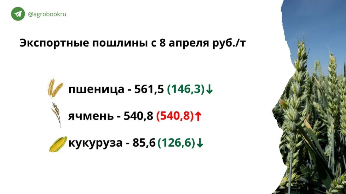 Пошлины на экспорт пшеницы и кукурузы с 8 апреля немного снизились, пошлина на ячмень выросла до 540,8 рубля за тонну.