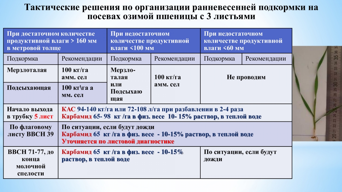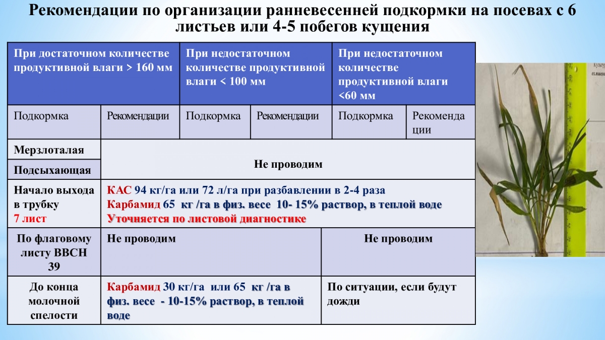Если влаги – от 60 до 100 миллиметров, то придётся выбрать между подкормкой по мёрзло-талой или по подсыхающей почве. Азот в этот период будет стимулировать появление третьего, четвёртого побега кущения – но чтобы «вытянуть» их впоследствии, влаги может просто не хватить.