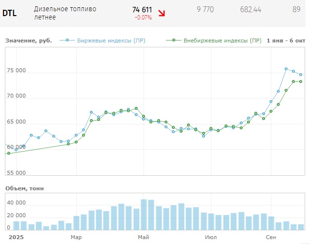 Однако уже в начале сентября биржевые и внебиржевые индексы солярки обновили годовые максимумы и достигли рекордных значений. С 20 сентября национальный биржевой индекс летнего дизельного топлива не опускался ниже 68 тысяч рублей за тонну.