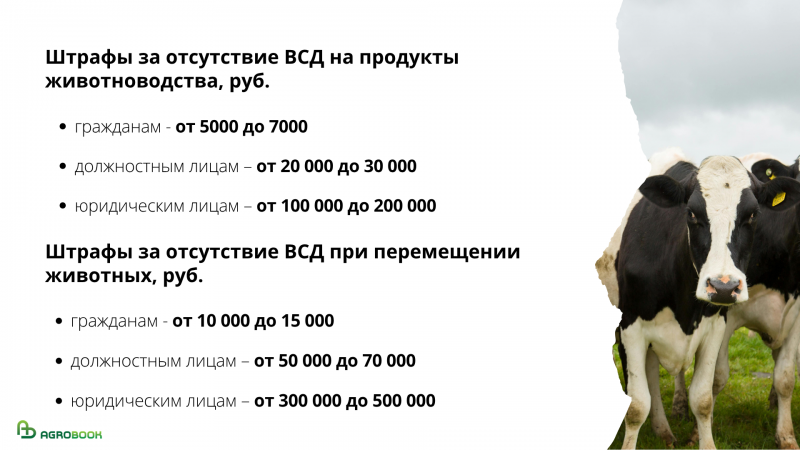 Минсельхоз России предложил дополнить Кодекс об административных правонарушениях отдельной статьёй, карающей за отсутствие или неправильное оформление ветеринарных сопроводительных документов. При перемещении или реализации продуктов животноводста предусмотрены штрафы от 5 до 7 тысяч рублей для граждан и от 100 до 300 тысяч рублей для юрлиц. Более строгая ответственность предусмотрена при перемещении животных без документов: 10-15 тысяч рублей для граждан и до 500 тыс. рублей для юрлиц.