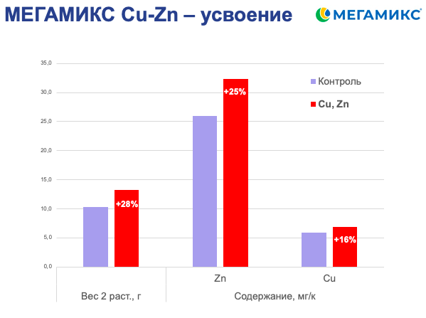- Препарат внесли по листу в фазе кущения. Через 10-15 дней ГЦАС «Ростовский» сделал отбор листьев. Что показали исследования? Во-первых, что увеличилась биомасса растений, за две недели [по сравнению с контролем] растение нарастило на 28% больше биомассы. Во-вторых, практически не произошло «биологического разбавления» – как это бывает при работе с протравителями. Несмотря на то, что биомасса увеличилась, все равно сохранилась более высокая концентрация элементов питания – меди и цинка – конкретно в растениях. То есть удобрения усвоились, сработали.