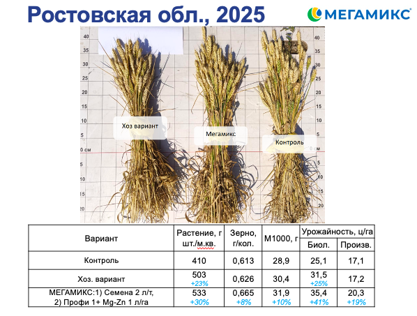 Другой опыт, проведенный уже в Миллеровском районе, показал конкретные выгоды, которые дает применение жидких удобрений. Перед посевом семена озимой пшеницы обработали соответствующим «МЕГАМИКСОМ-Семена» (дозировка – 2 л/т), плюс в фазе кущения растения получили подкормку «МЕГАМИКС-Профи» и «МЕГАМИКС-Магний -Цинк» (1 л/га).