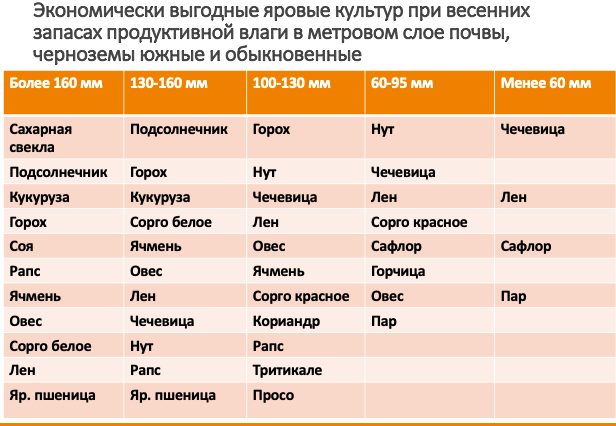 При выборе культур для весеннего сева прежде всего стоит оценить запасы влаги в метровом слое. Вроде очевидная истина, но многие аграрии ею пренебрегают. Если в метровом слое влаги меньше 160 мм, то ни о какой сахарной свекле речи быть не может, напоминает Лабынцев. Минимальный запас влаги для масличного подсолнечника – 130 мм. Для крупноплодного подсолнечника этот показатель должен быть не менее 230 мм в двухметровом слое.